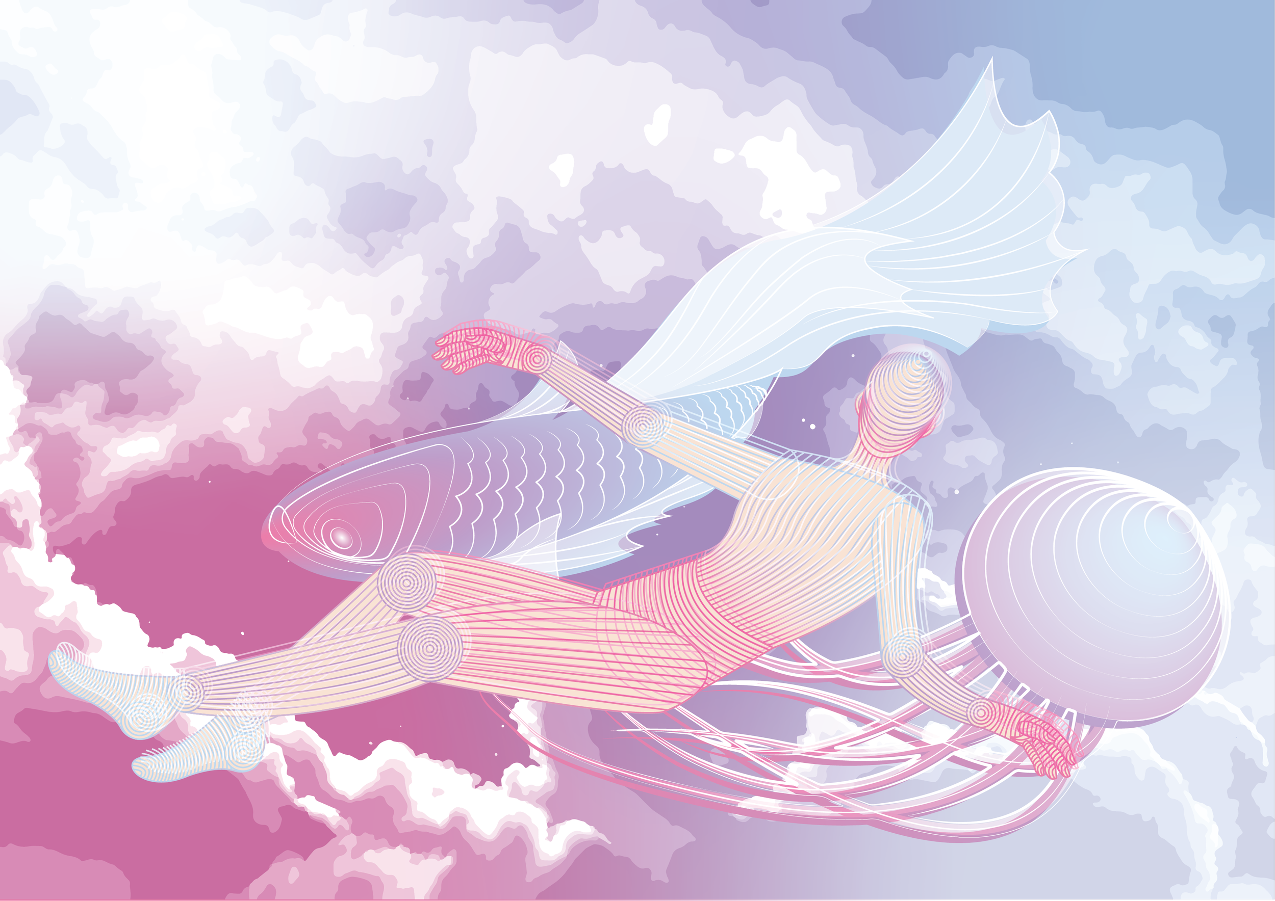 The first illustration is expanded from the Dream Photo Composition project, further developing its originality through more comfortable means of digital imagery techniques (having more expertise in Illustrator than Photoshop), composed of pastel colours, varying lines and soft gradients. There was a lot of experimentation for blending shapes and blending modes to discover various ways to creating mesmerising effects.