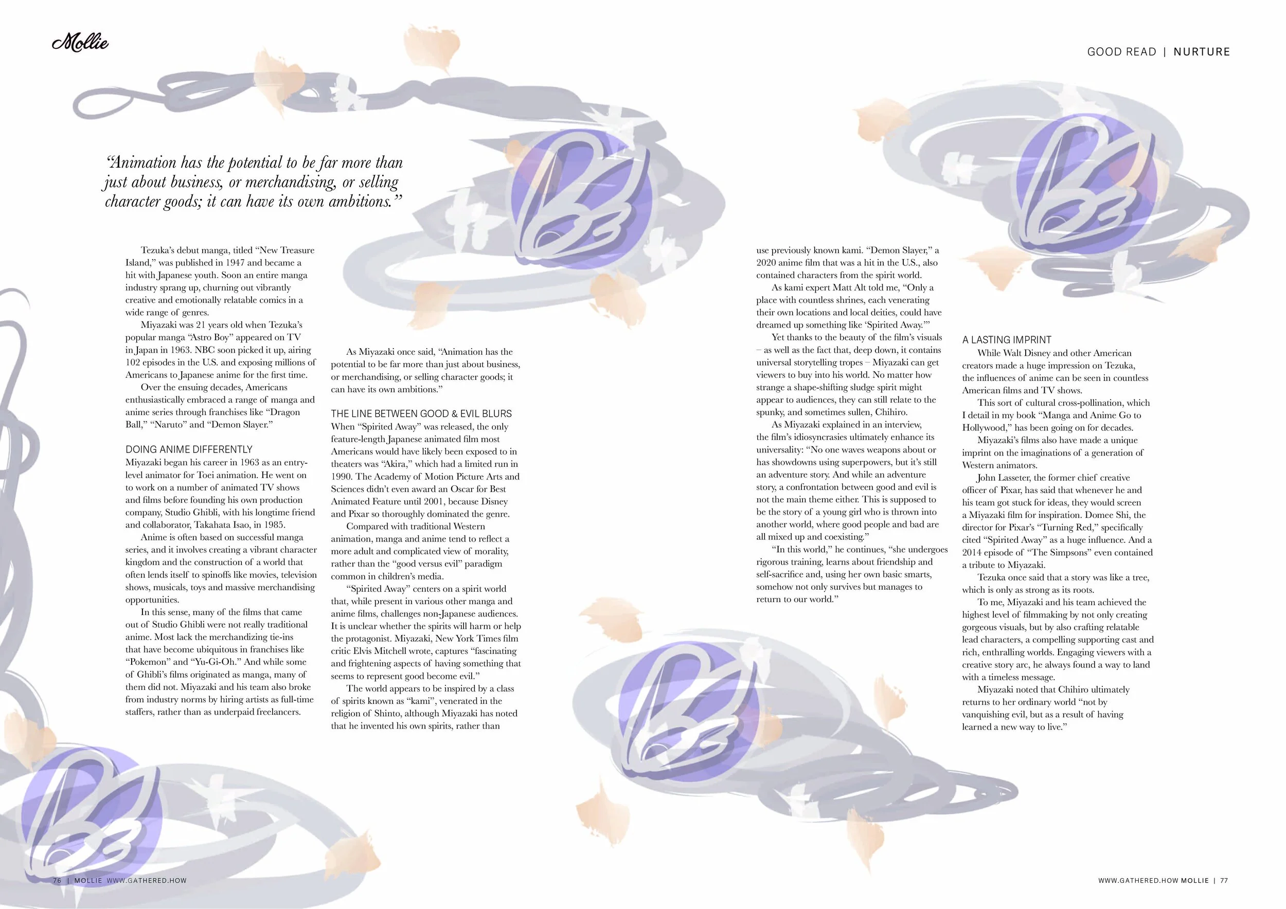 Based on a magazine spread extracted from a Mollie magazine and an online Studio Ghibli article, two sets of illustrations were produced. The illustrations depict the main characters and other motifs relevant to the article, conveying its genre through a very detailed composition of vibrant colours, varying textures and abstract forms. The text extracted from the online article is formatted with the same textual properties as the original Mollie magazine double page spread; the same process was applied to the web page.